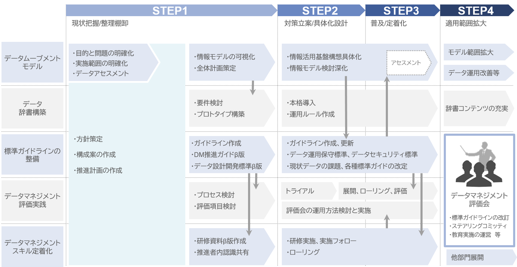 今回は上記4点を紹介しましたが、実際にデータガバナンスに取り組むには企業のデータマネジメントの推進状況やデータ基盤などの環境の構築や利用状況、データガバナンスを取り組むきっかけなどケースごとに進め方が異なります。例えば、既にデータガバナンスに取り組んでいるが期待した効果が得られないため再構築したいといった企業には、最初に現状の評価を行った上で必要性や目的の再設定が必要となります。