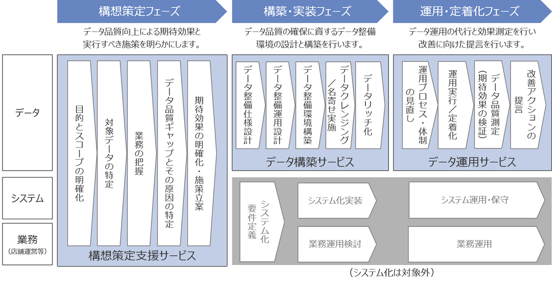 顧客データや商品データの表記の統一を行うデータ整備や、属性の付加などのデータリッチ化(充実化)を行うための環境の設計と構築の実施と、データ整備の実作業を行います。