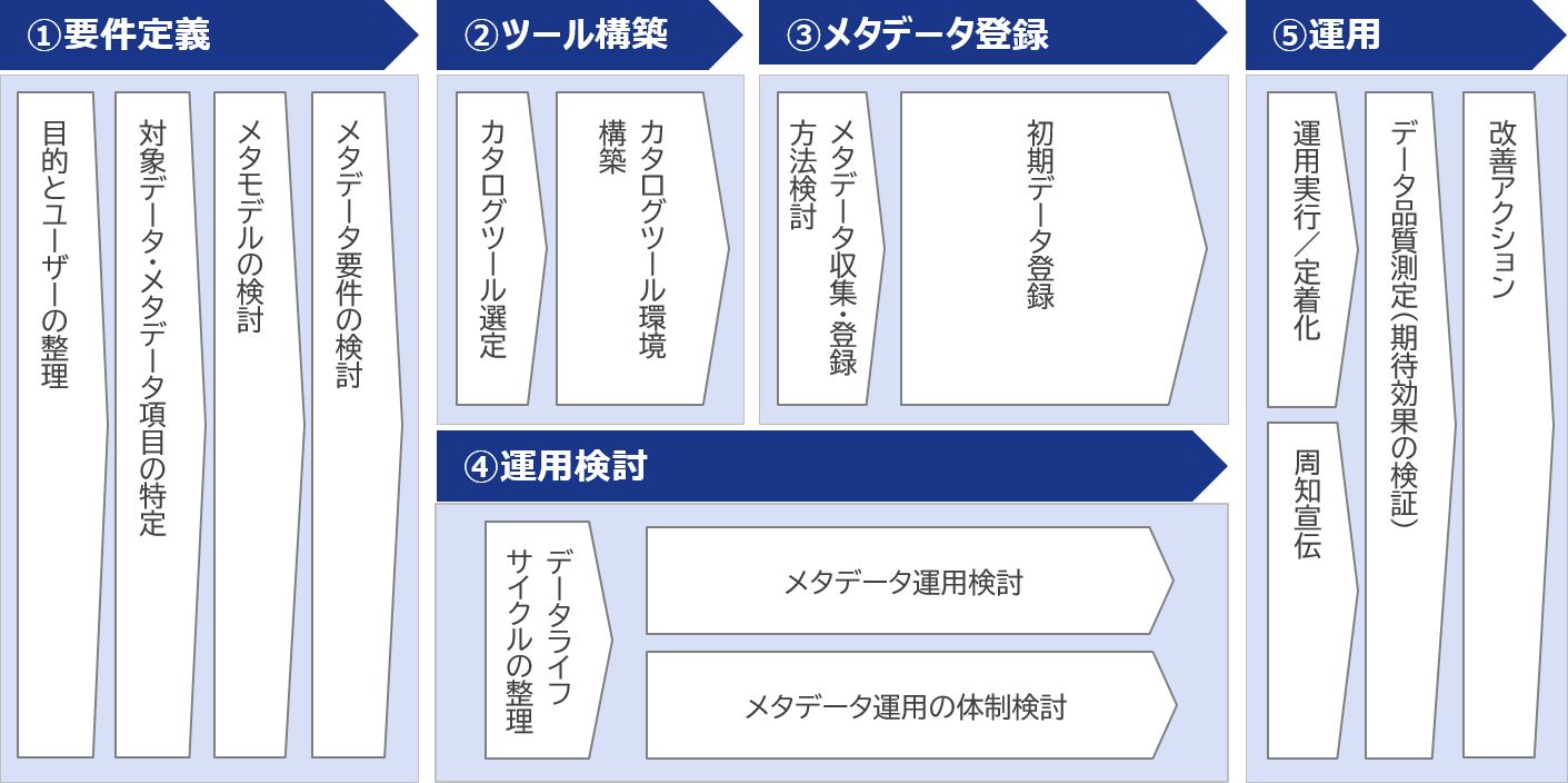 このステップを飛ばしてツール導入やメタデータ収集を行うと、利用者が必要とするメタデータが揃っていない状態に陥り、使い勝手の悪いシステムになってしまいます。また、スコープ定義を曖昧にしてしまうと、不要なメタデータまで収集してしまい、メタデータのボリュームが膨れ上がってしまいます。そうすると、データカタログの利用開始まで多大な時間を要してしまいますし、管理工数やコストの負担も増してしまいます。