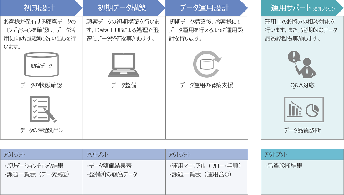 また初期構築後もお客様組織の変更やシステム更改によるデータ運用上の相談対応や、定期的なデータ品質診断の実施によるサポートも可能です。